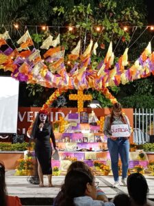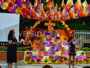 En la celebración, destacó también la participación de la Mtra. Ileana Karina Gómez Rincón, quien presentó la semblanza y escenificación “Alegoría del Altar de Muertos”. Asimismo, se desarrolló la presentación y concurso de figuras icónicas y fundamentales de esta tradición: las catrinas y catrines, símbolo de la muerte festiva, representando el mestizaje cultural y la conexión entre la vida y la muerte, así como la premiación y lectura de calaveritas literarias. Los asistentes disfrutaron también de muestras de folclor, con algunos números de baile a cargo de las estudiantes Stephany Odette Angulo García, del 5o semestre, y Fanny Elizabeth Navarrete Verduzco de 3er. semestre.