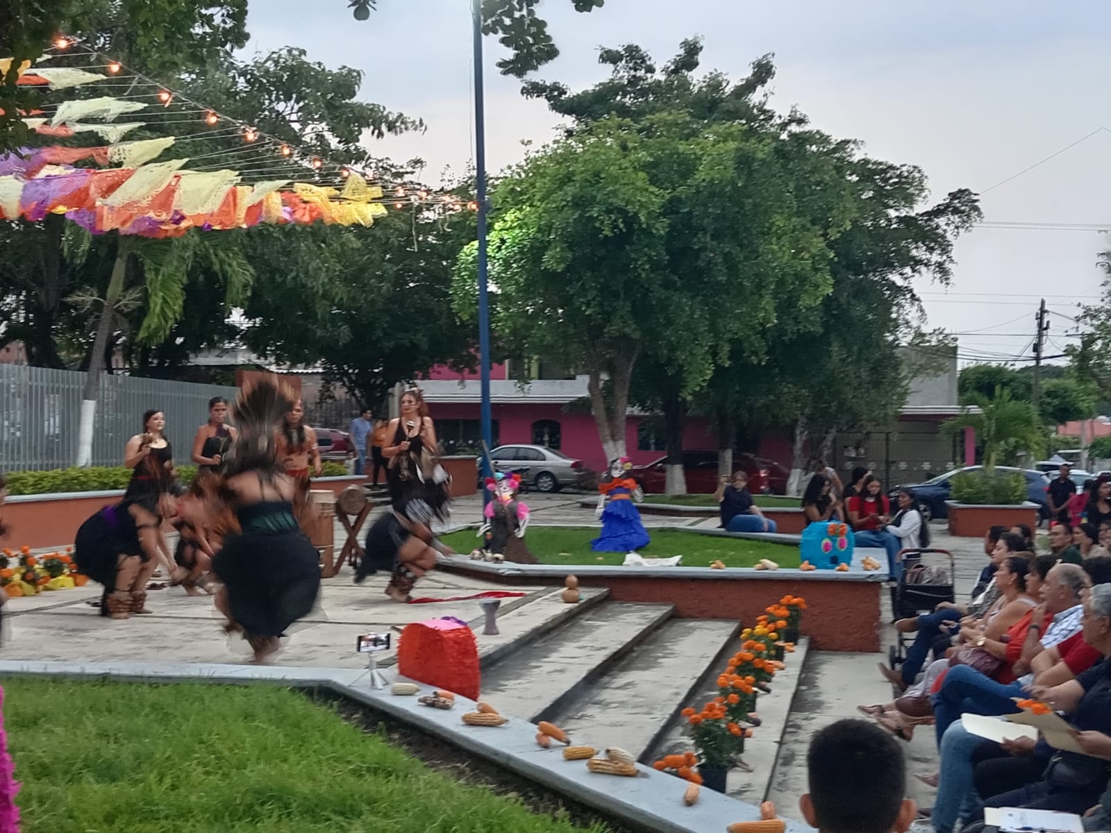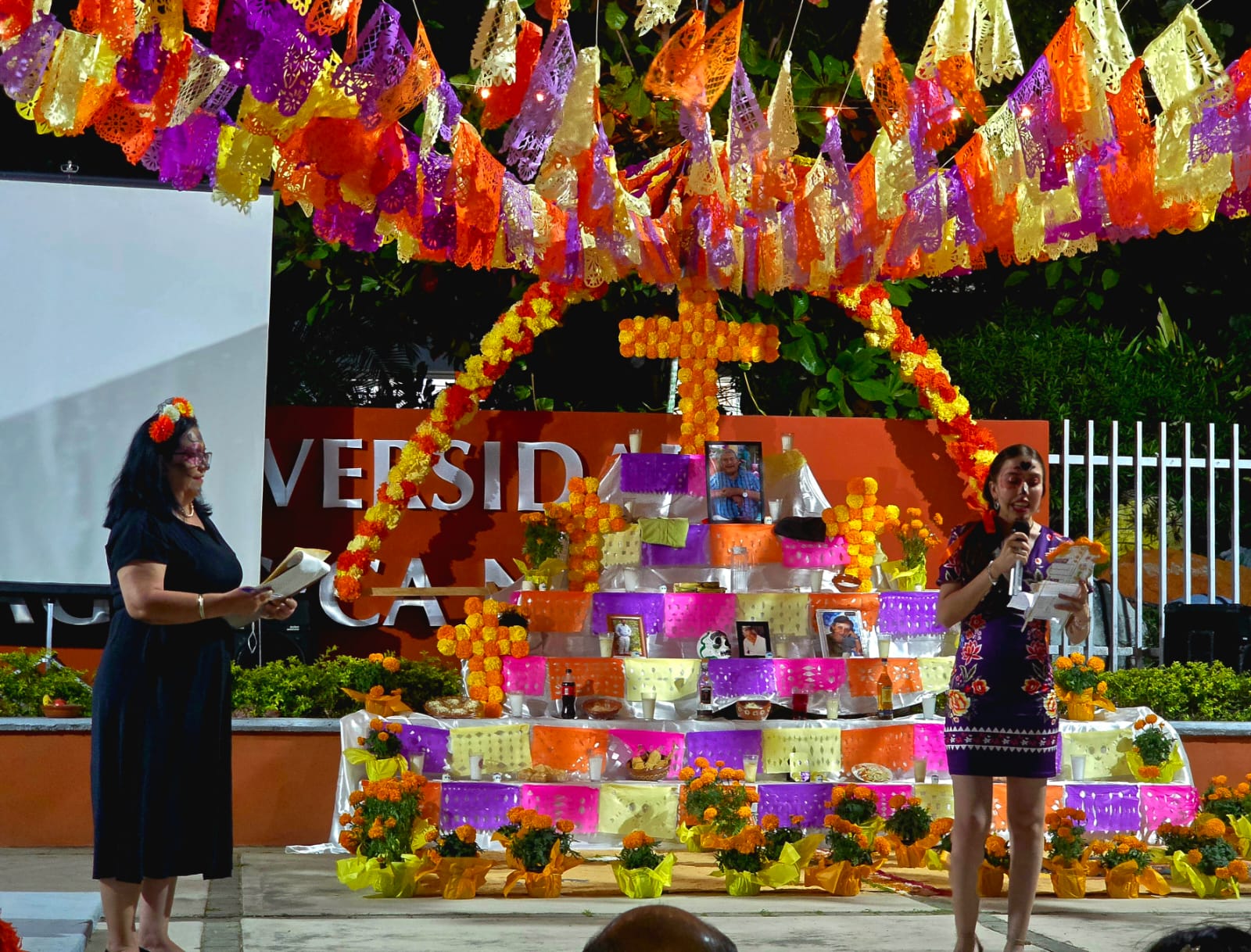 El festival abrió con una ceremonia a cargo de los integrantes del grupo Xolotl Mitotiliztli, con una danza prehispánica como elemento ancestral de la celebración, donde el copal y el incienso, resaltaron el ambiente cultural y tradicional al ritmo de tambores, junto al altar monumental dedicado este año al Sr. Genaro Ortega Santana, colaborador por 30 años en esta casa de estudios; altar de siete pisos, cuya explicación de cada elemento, estuvo a cargo de estudiantes de los diversos semestres de ambos turnos, quienes con el aroma dulce y terroso del cempasúchil, las coloridas ofrendas, las calaveritas de azúcar, fotografías y objetos que cuentan historias, invitaban a recordar con alegría y respeto a los seres queridos.