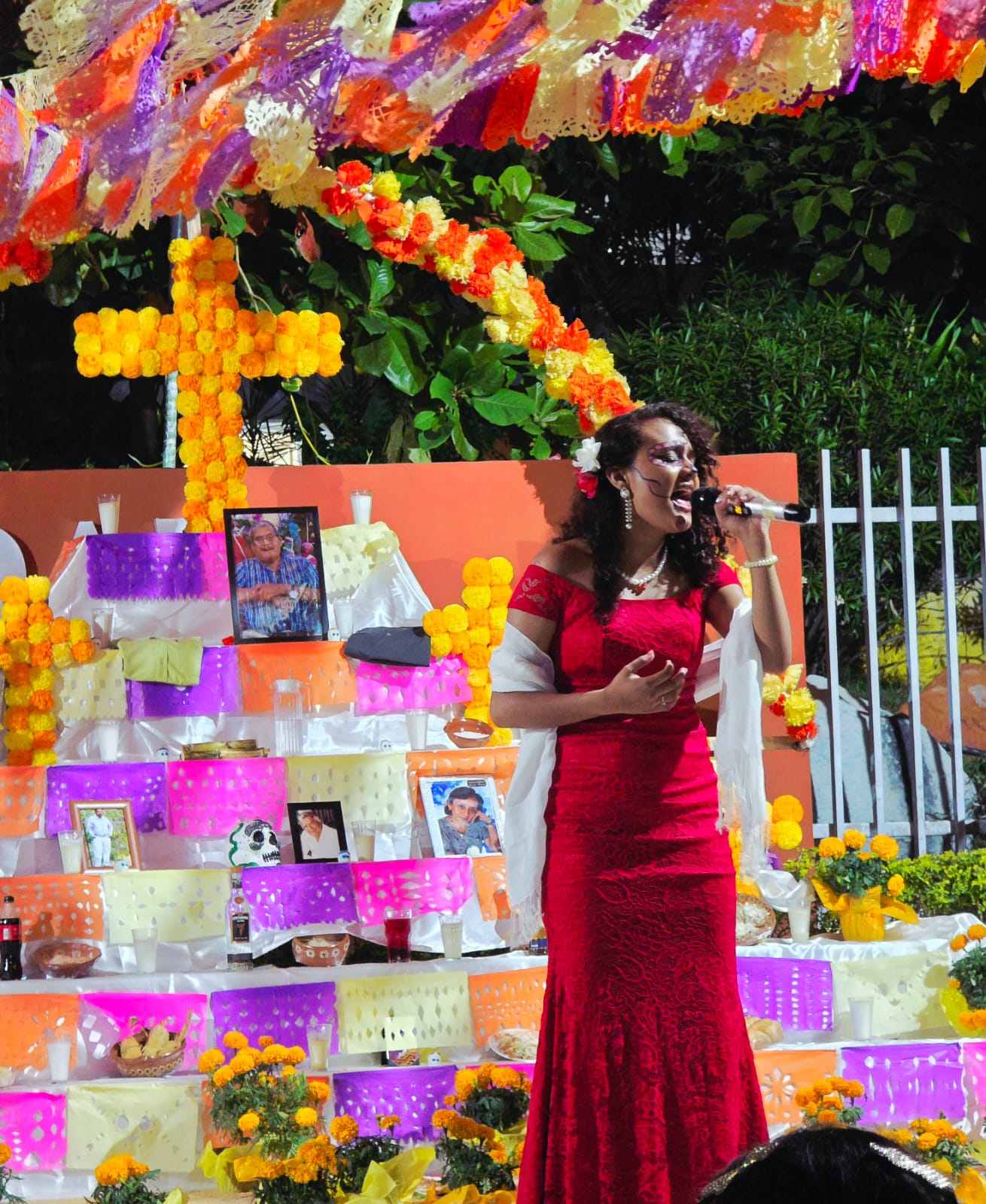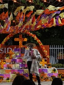 Como parte de la tradición y la cosmovisión mexicana de la muerte, un colectivo estudiantil del turno vespertino escenificó la obra “Francisca y la muerte”, deleitando al público que se dio cita en la explanada para escuchar también, en la voz de la estudiante Fátima Yerania Rolón Medina de 1er semestre, la melodía tradicional “La llorona”.