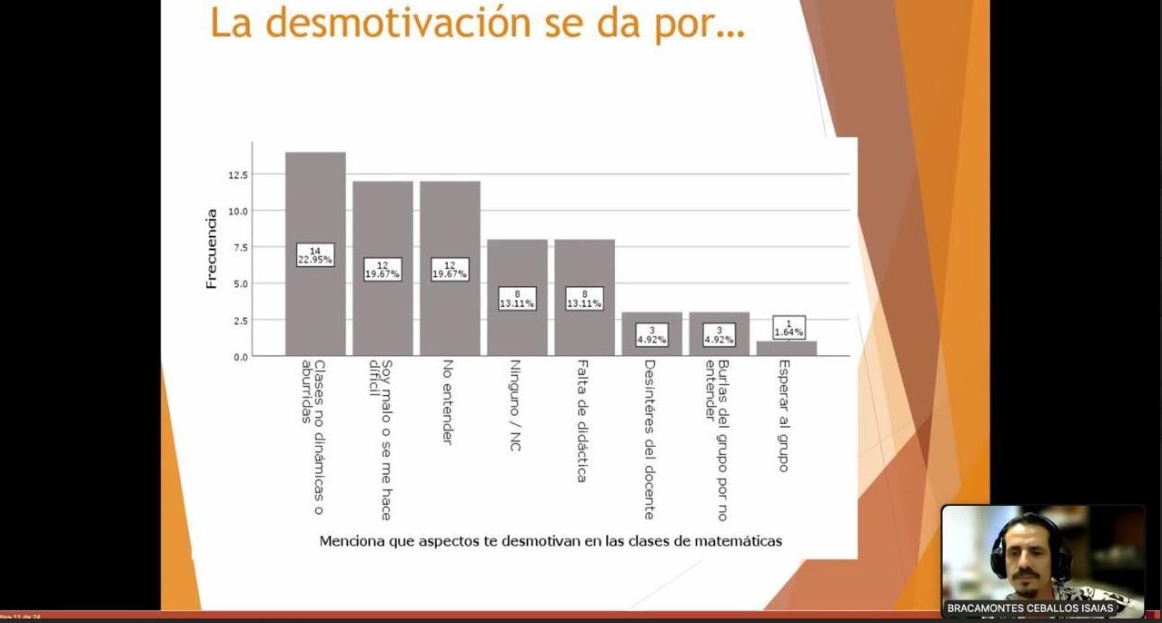Entre los factores detectados mencionó el género, el autoconcepto, la falta de uso de Excel, el entorno familiar y la actitud hacia las matemáticas. Señaló que la ansiedad matemática afecta el aprendizaje de las y los estudiantes, por lo que su comprensión es clave para diseñar estrategias institucionales de acompañamiento emocional y tutorial.