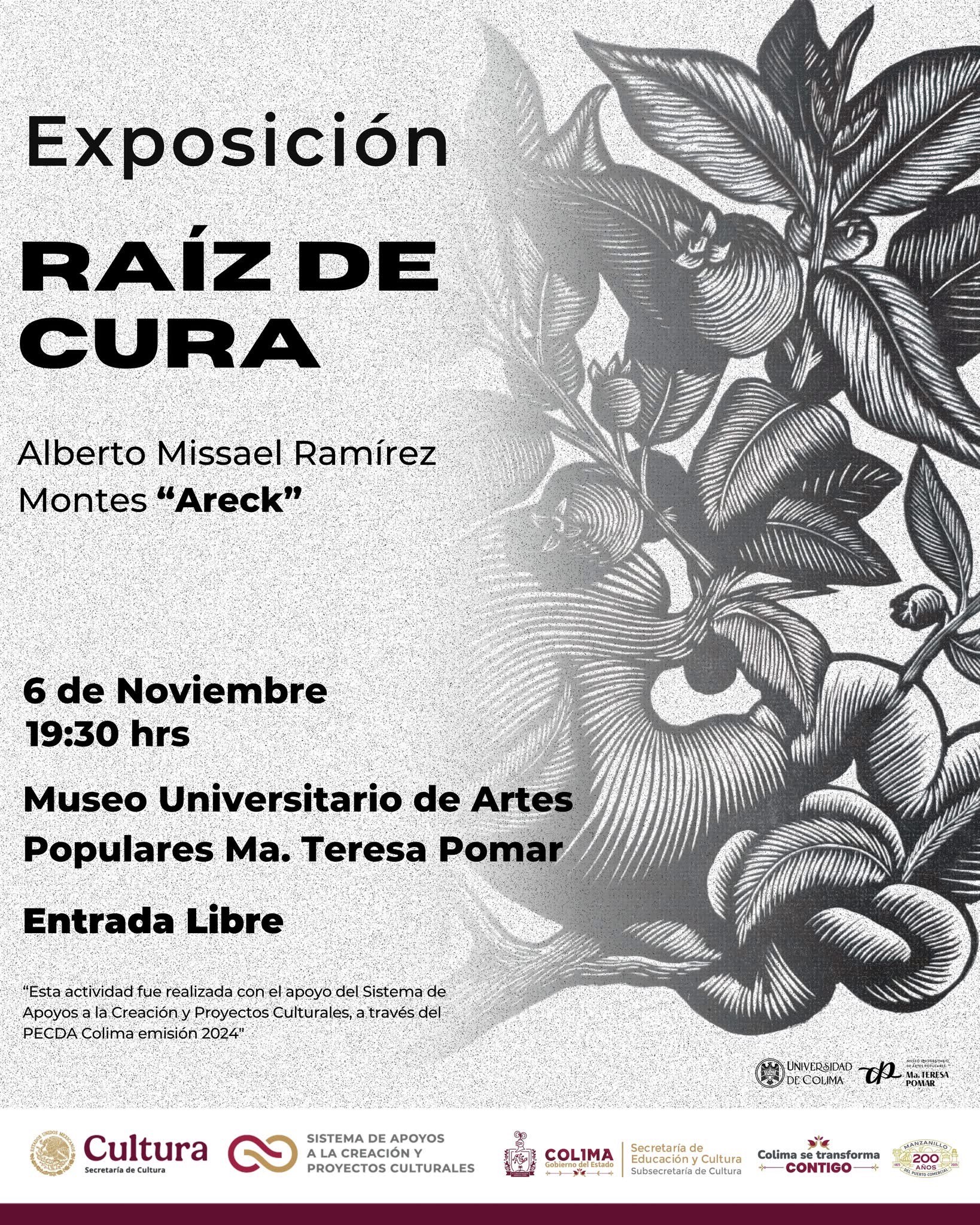 El Museo Universitario de Artes Populares “María Teresa Pomar” (MUAP) anuncia la próxima inauguración de la exposición temporal “Raíz de Cura”, una muestra que celebra la riqueza y el conocimiento ancestral de la medicina tradicional mexicana a través del arte del grabado. La exposición reúne una serie de obras del artista visual colimense Alberto Missael Ramírez Montes, conocido como “Areck”, beneficiario del Programa de Estímulo a la Creación y Proyectos Culturales (PECDA 2024).