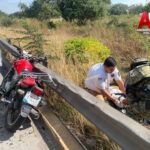 Colima, Col.— Paramédicos del Centro Regulador de Urgencias Médicas (CRUM) del Gobierno del Estado, en coordinación con elementos de la Policía Estatal y de la Secretaría de Marina-Armada de México, brindaron atención inmediata al conductor de una motocicleta que perdió el control e impactó contra el muro de contención sobre el Libramiento Ejército Mexicano, la tarde de este sábado.
