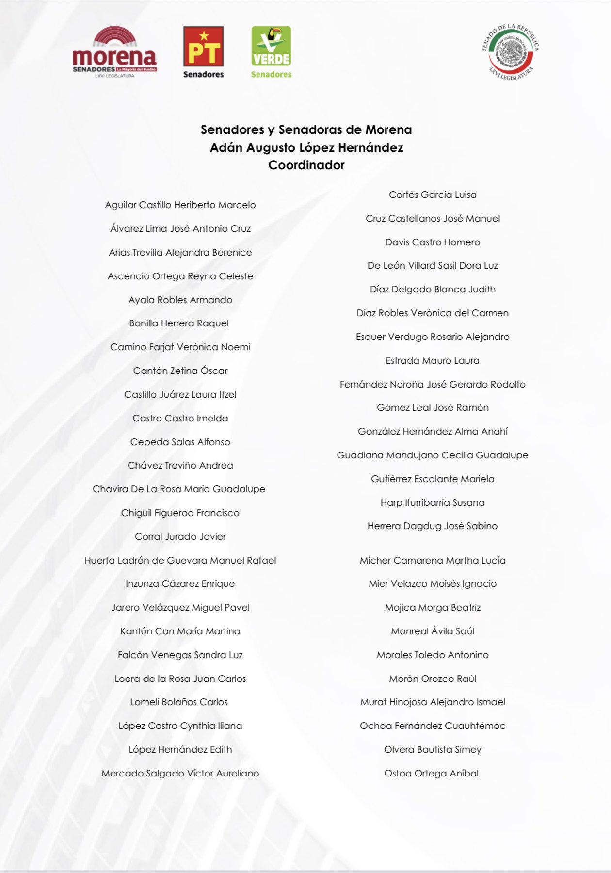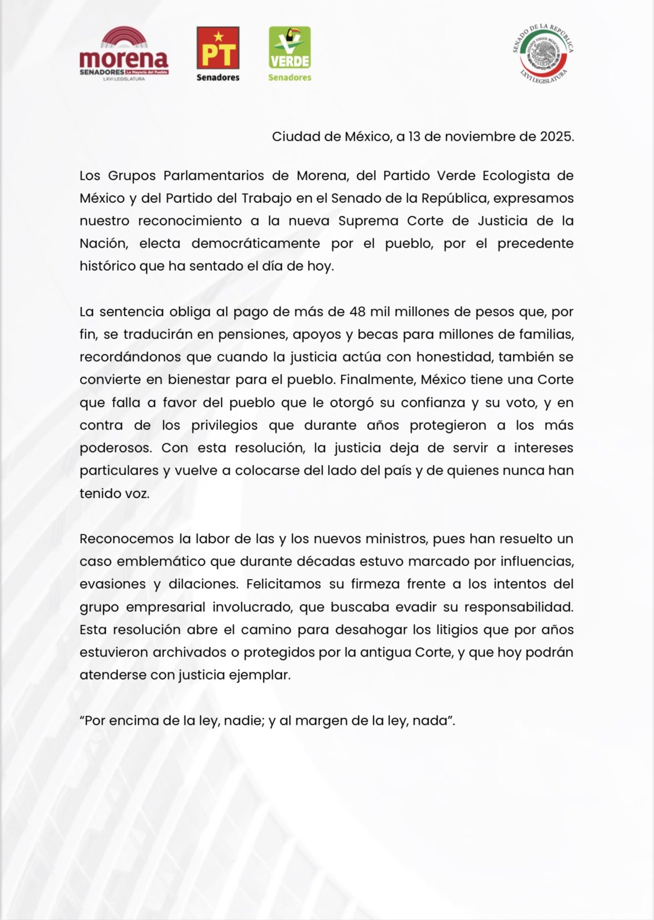 Los Grupos Parlamentarios de Morena, del Partido Verde Ecologista de México y del Partido del Trabajo en el Senado de la República, expresamos nuestro reconocimiento a la nueva Suprema Corte de Justicia de la Nación, electa democráticamente por el pueblo, por el precedente histórico que ha sentado el día de hoy.