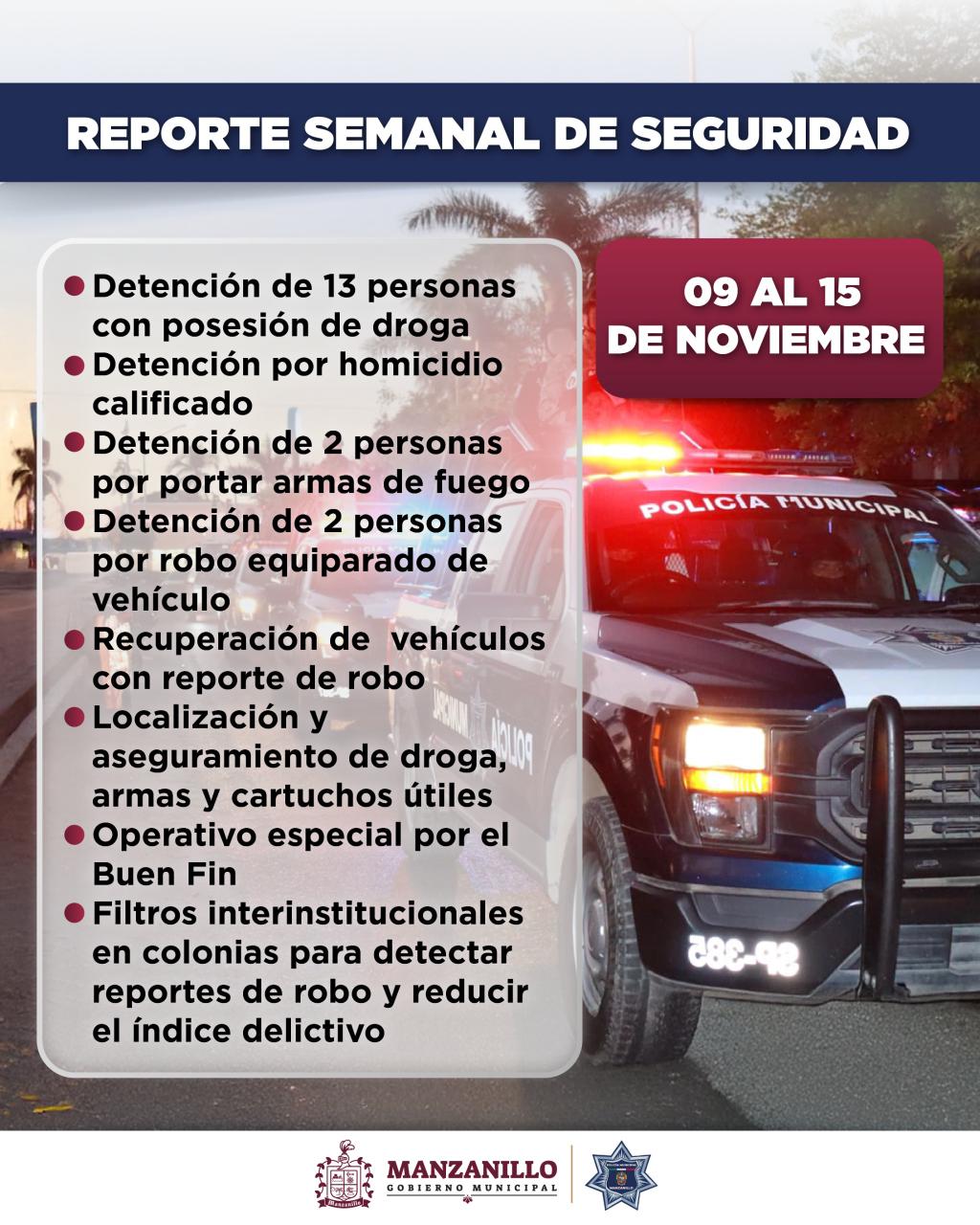 La Dirección de Seguridad Pública de Manzanillo informa que, durante patrullajes permanentes realizados en el municipio, se efectuaron diversas acciones relevantes, entre ellas destacan: la detención de trece personas por la posesión de sustancias ilícitas, una por homicidio culposo, dos por posesión de armas con cartuchos útiles y dos más por robo equiparado de vehículo.