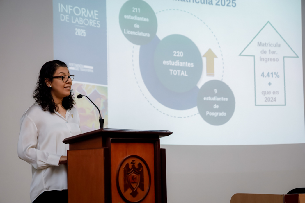 Respecto a la planta docente, la directora destacó que ocho docentes pertenecen al Sistema Nacional de Investigadores e Investigadoras, cinco en Nivel I y 3 en Nivel de Candidato. “Los resultados de la investigación realizada este año por el profesorado de tiempo completo suman 16 productos académicos de calidad, ocho artículos en revistas indexadas, doce en revistas arbitradas, cinco capítulos de libro y un libro”.
