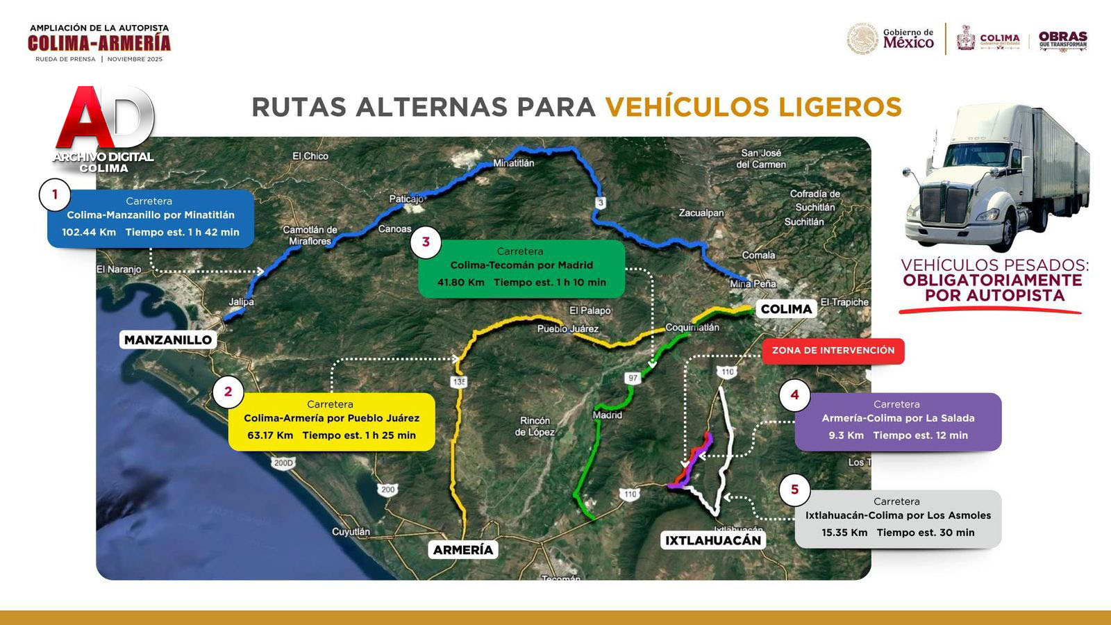 El Gobierno del Estado dio a conocer cinco rutas alternas para vehículos ligeros, debido a los trabajos que continúan realizándose en el tramo conocido como La Salada, como parte de la ampliación de la autopista Colima–Armería.