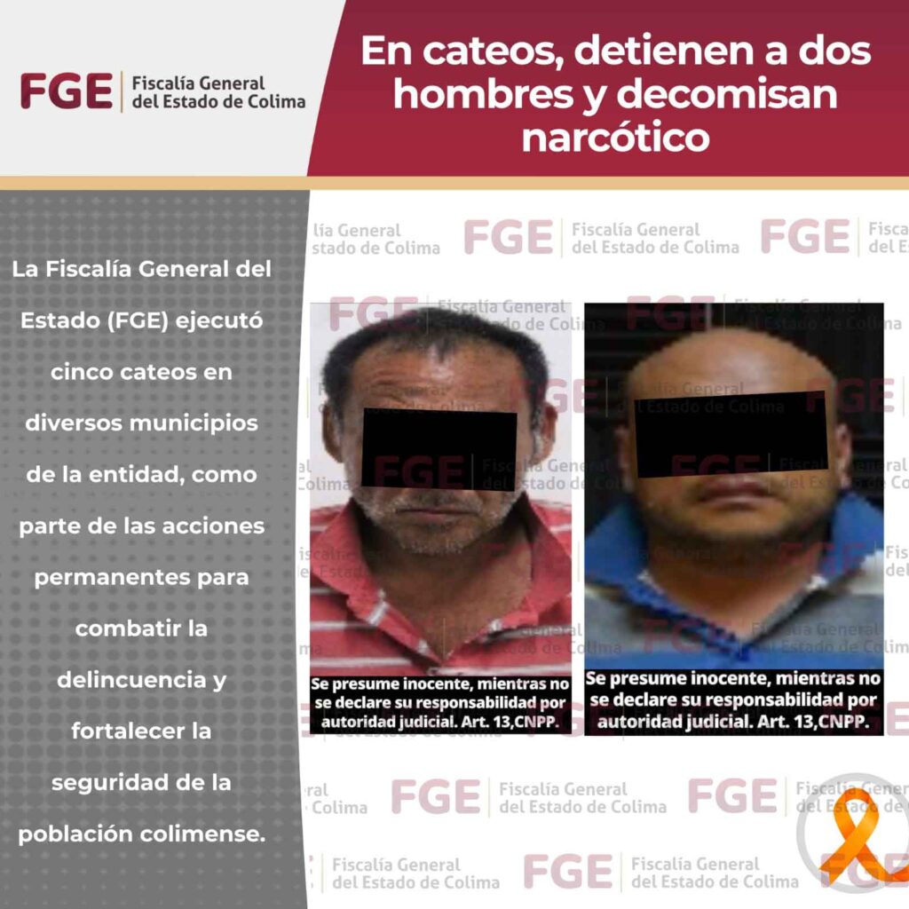 La Fiscalía General del Estado (FGE) ejecutó cinco cateos en diversos municipios de la entidad, como parte de las acciones permanentes para combatir la delincuencia y fortalecer la seguridad de la población colimense.