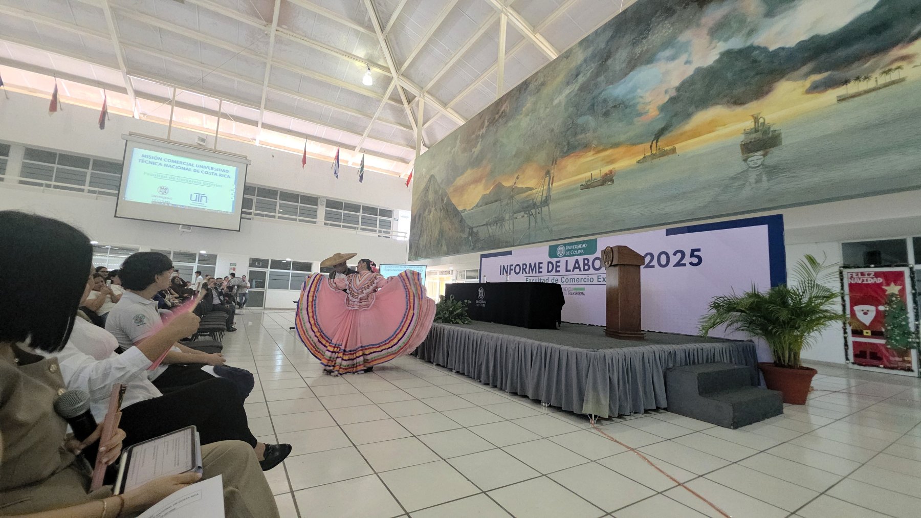 Como primera actividad, la delegación visitante asistió como invitada especial al informe de labores del Dr. Noé López Alvarado, director de la Facultad, donde pudieron conocer los avances, proyectos e indicadores que consolidan la visión institucional de la UdeC.