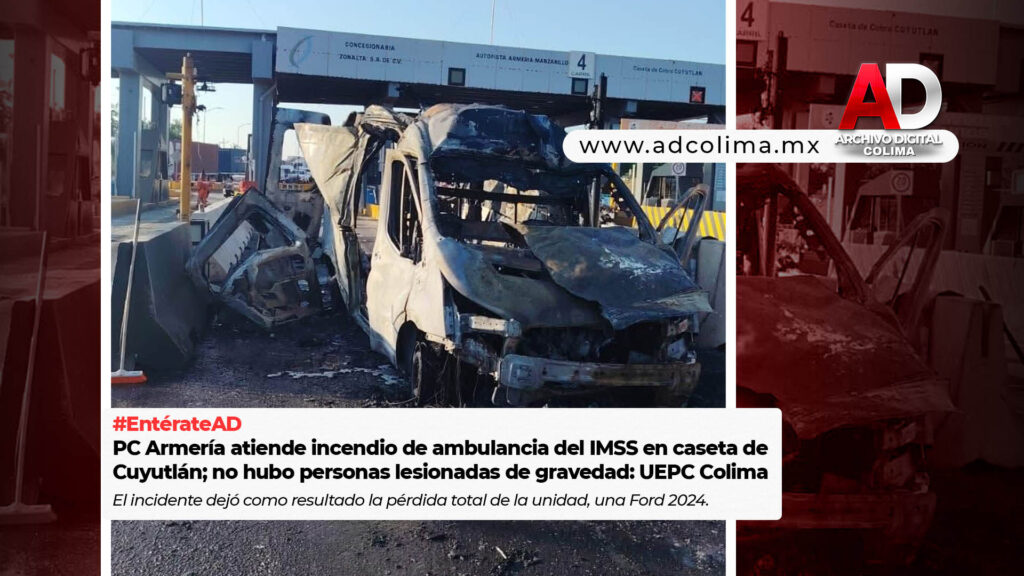 La Unidad Estatal de Protección Civil (UEPC) del Gobierno del Estado de Colima informa que, la tarde de este miércoles, personal de Protección Civil Armería atendió el incendio de una ambulancia en la caseta de cobro Cuyutlán, ubicada en la autopista Manzanillo–Colima, dentro del municipio de Armería.