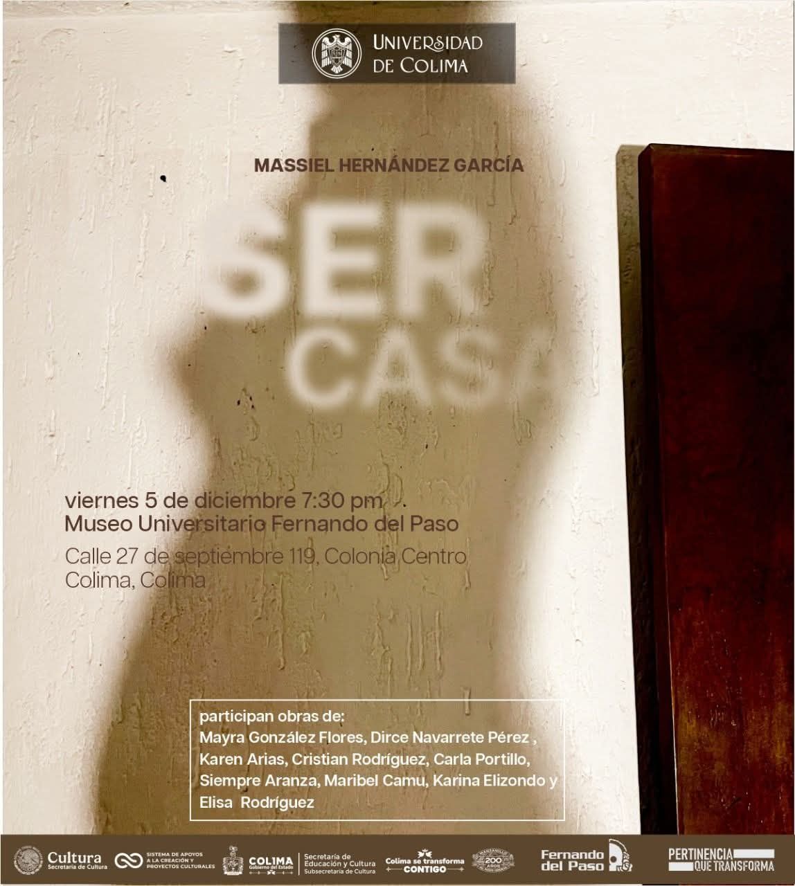 La cita para el acto inaugural de “Ser casa” es este viernes 5 de diciembre, a las siete y media de la tarde, en el Museo Universitario Fernando del Paso, ubicado en la calle 27 de septiembre #119, en el centro de Colima. La entrada es libre para todo el público.