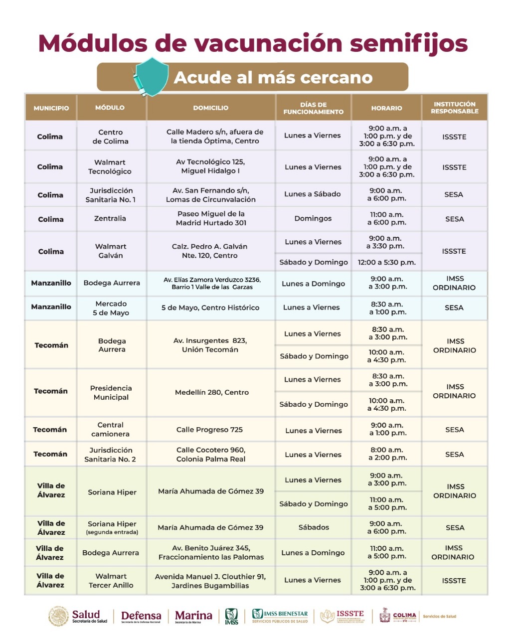 En Tecomán están ubicados cuatro módulos de vacunación: en la Central Camionera y en la Jurisdicción Sanitaria No. 2 (de lunes a viernes, por las mañanas) y en Bodega Aurrerá y la Presidencia Municipal (de lunes a viernes y el sábado y domingo, por la mañana y tarde).