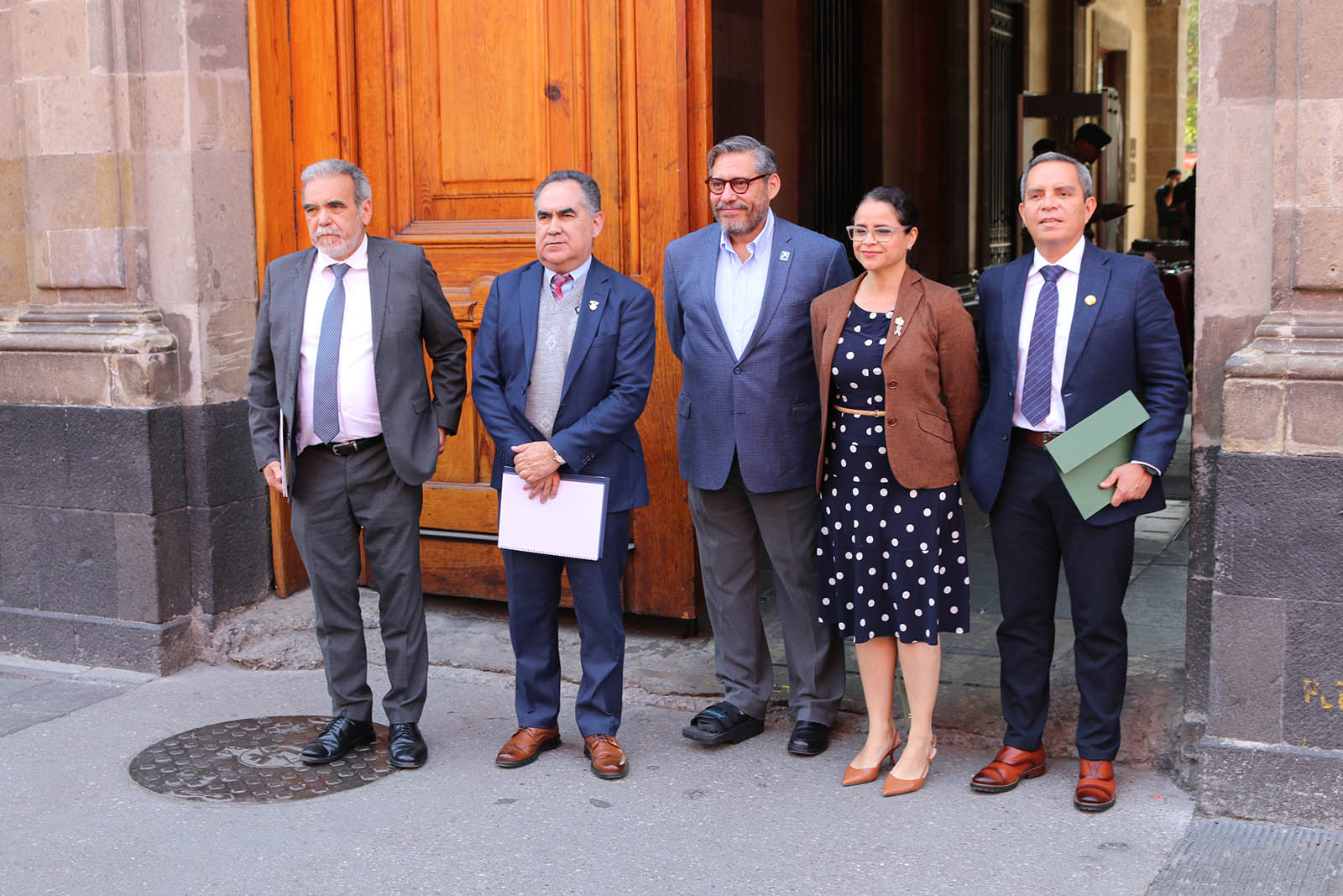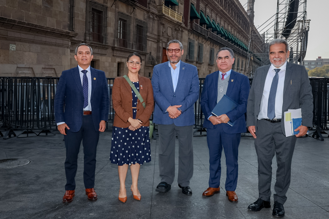 El secretario general ejecutivo de la ANUIES, Dr. Luis González Placencia; la rectora Norma Galván Meza (Universidad Autónoma de Nayarit) y los rectores Jesús Madueña Molina (Universidad Autónoma de Sinaloa), Christian Jorge Torres Ortiz Zermeño (Universidad de Colima) y Martín Aguilar (Universidad Veracruzana), sostuvieron este jueves 4 de diciembre una reunión de trabajo en Palacio Nacional con Eddu Vera Anaya, jefe de la Oficina del secretario de Hacienda y Crédito Público.