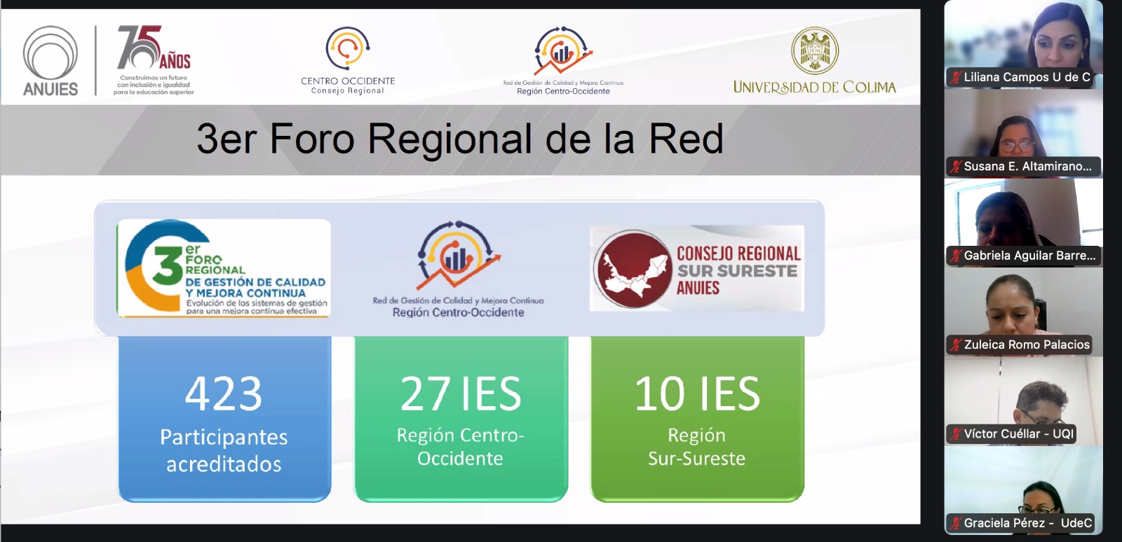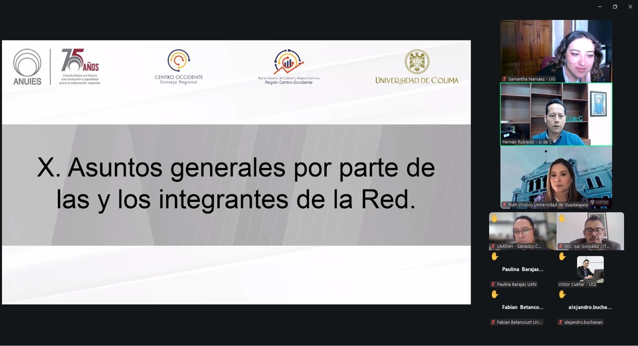 De manera virtual, la Red de Gestión de Calidad y Mejora Continua de la Asociación Nacional de Universidades e Instituciones de Educación Superior (ANUIES) de la Región Centro Occidente, realizó con éxito su Décima Reunión Ordinaria, en la cual se presentaron las acciones y resultados alcanzados durante el año.