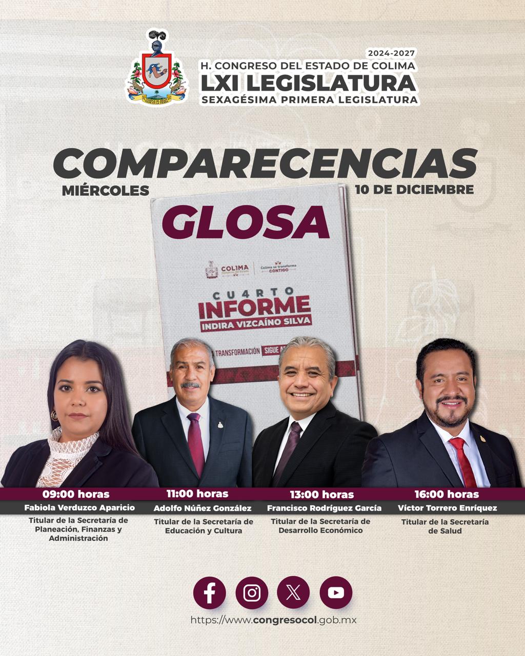 Este miércoles 10 de diciembre, en el H. Congreso del Estado de Colima, dará inicio la sesión permanente para la Glosa del 4° Informe de Gobierno, en la que se realizará un análisis más detallado del documento presentado por la titular del Poder Ejecutivo del Estado, Indira Vizcaíno Silva, y para lo cual fueron citados funcionarias y funcionarios de la administración estatal.