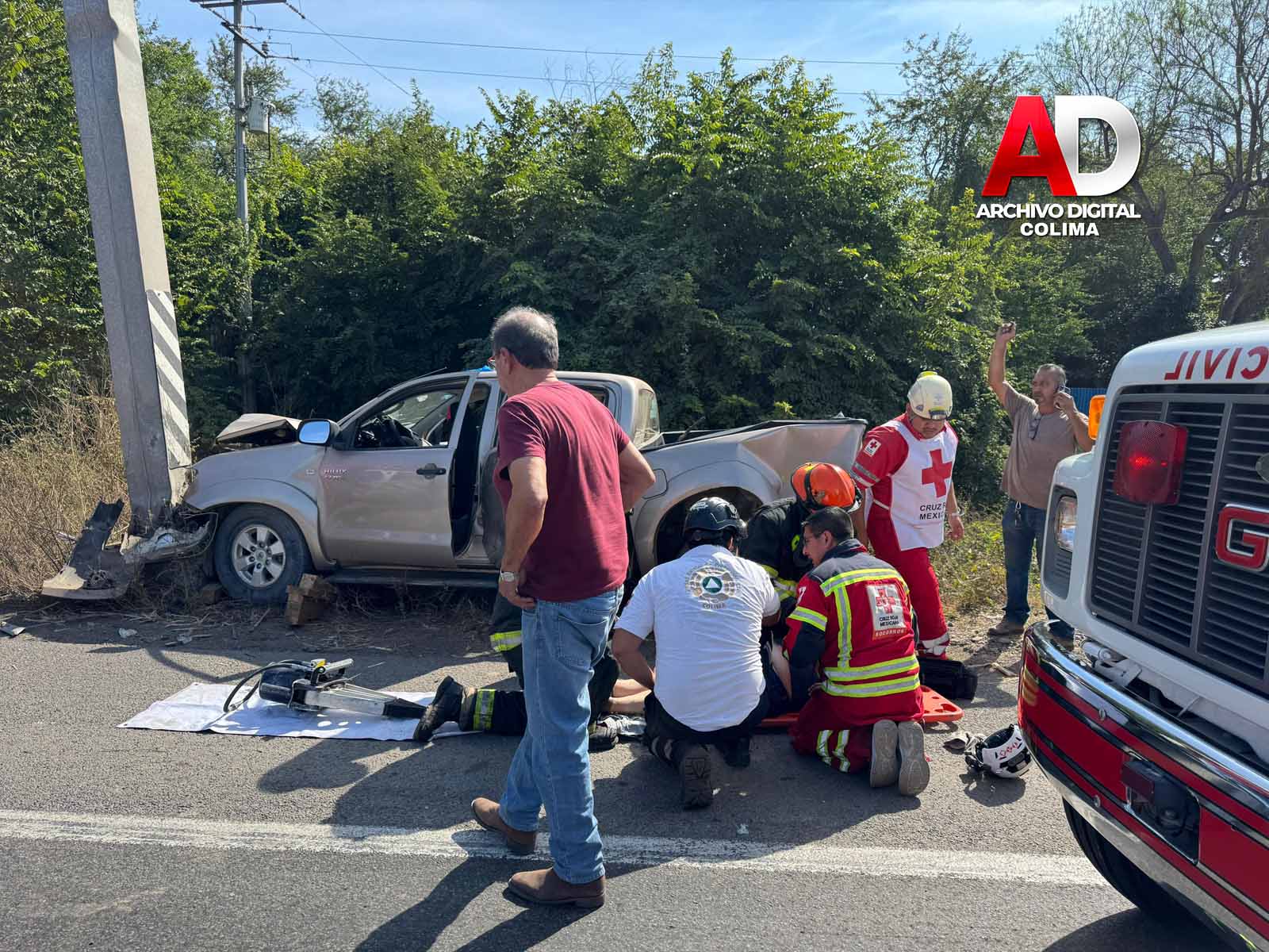 La mañana de este domingo, paramédicos de Cruz Roja Colima atendieron un accidente vial en el que una camioneta tipo pick up fue impactada por un tráiler y posteriormente se proyectó contra un poste.