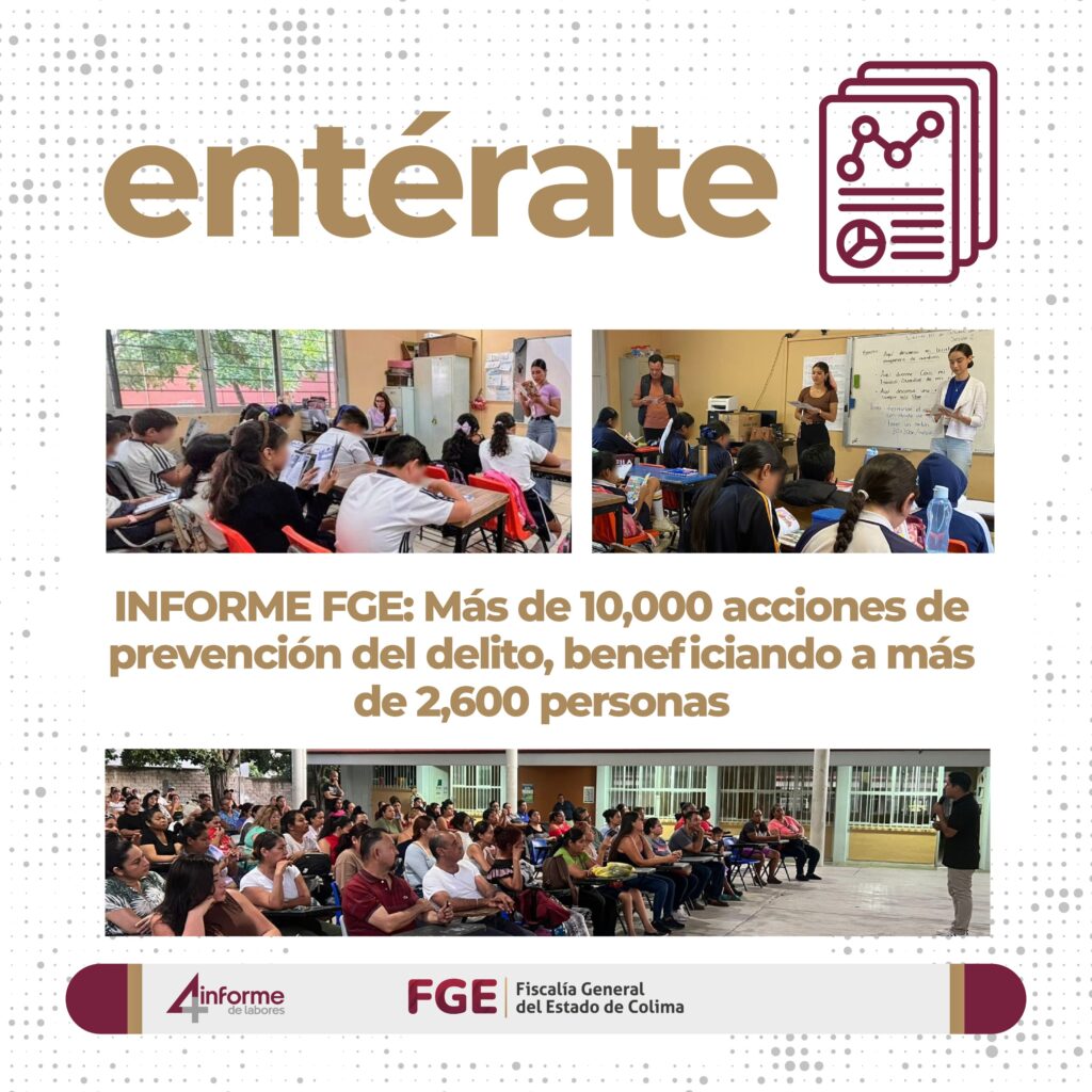 La Fiscalía General del Estado (FGE), a través de su Dirección de Prevención del Delito y Atención a Víctimas, ha impulsado durante el periodo del 1 de noviembre de 2024 al 31 de octubre de 2025 diversas iniciativas para mejorar la seguridad, fortalecer la confianza de la ciudadanía y promover la cultura de paz en el Estado de Colima. A través del programa COLIMENTES, se han realizado 10,512 acciones que han beneficiado directamente a 2,656 personas, enfocándose principalmente en la salud mental, el fortalecimiento de las habilidades socioemocionales y la promoción de entornos seguros en los niveles educativos del estado.