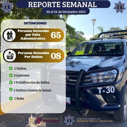 El Gobierno Municipal de Tecomán, encabezado por el presidente municipal, Armando Reyna Magaña, a través de la Dirección General de Seguridad Pública y Policía Vial, dio a conocer los resultados obtenidos en la semana del 20 al 26 de diciembre de este año, derivado de los distintos operativos y programas implementados de manera permanente en el municipio.