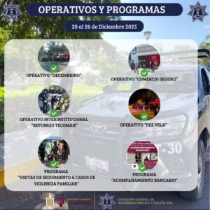 Entre los operativos realizados durante el periodo destacan el Operativo Decembrino, Operativo Comercio Seguro, Operativo Interinstitucional “Refuerzo Tecomán”, Operativo Pez Vela, el Programa de Visitas de Seguimiento a Casos de Violencia Familiar y el Programa de Acompañamiento Bancario, los cuales han permitido fortalecer la prevención del delito y la atención ciudadana.