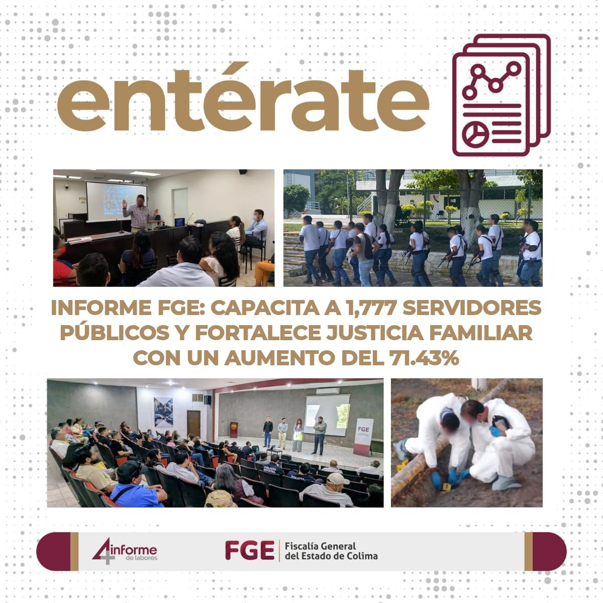 La Fiscalía General del Estado de Colima (FGE), a través de la Dirección de Capacitación y Formación Profesional, impulsó durante el periodo de noviembre de 2024 a octubre de 2025 una estrategia de fortalecimiento institucional orientada a la profesionalización del personal y la mejora continua del servicio público.