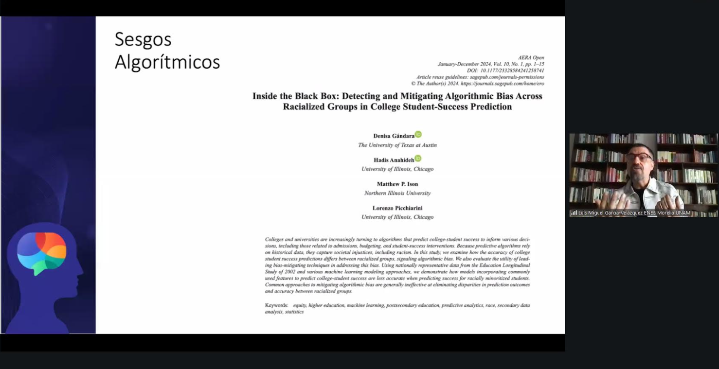 Dijo que actualmente en las universidades se están realizando investigaciones sobre las interacciones y los resultados que estas herramientas tecnológicas emiten, ya que se basan en algoritmos e información que los propios usuarios ingresan. Los algoritmos de inteligencia artificial que se utilizan de manera cotidiana “tienen sesgos porque han sido creados de esa manera; la pregunta ahora es: ¿si se hacen las correcciones de sesgos, podríamos hacer un ejercicio efectivo? Es decir, ¿se ve que podrán resolverse en un mediano plazo? Y la respuesta es: “pensamos que no”.