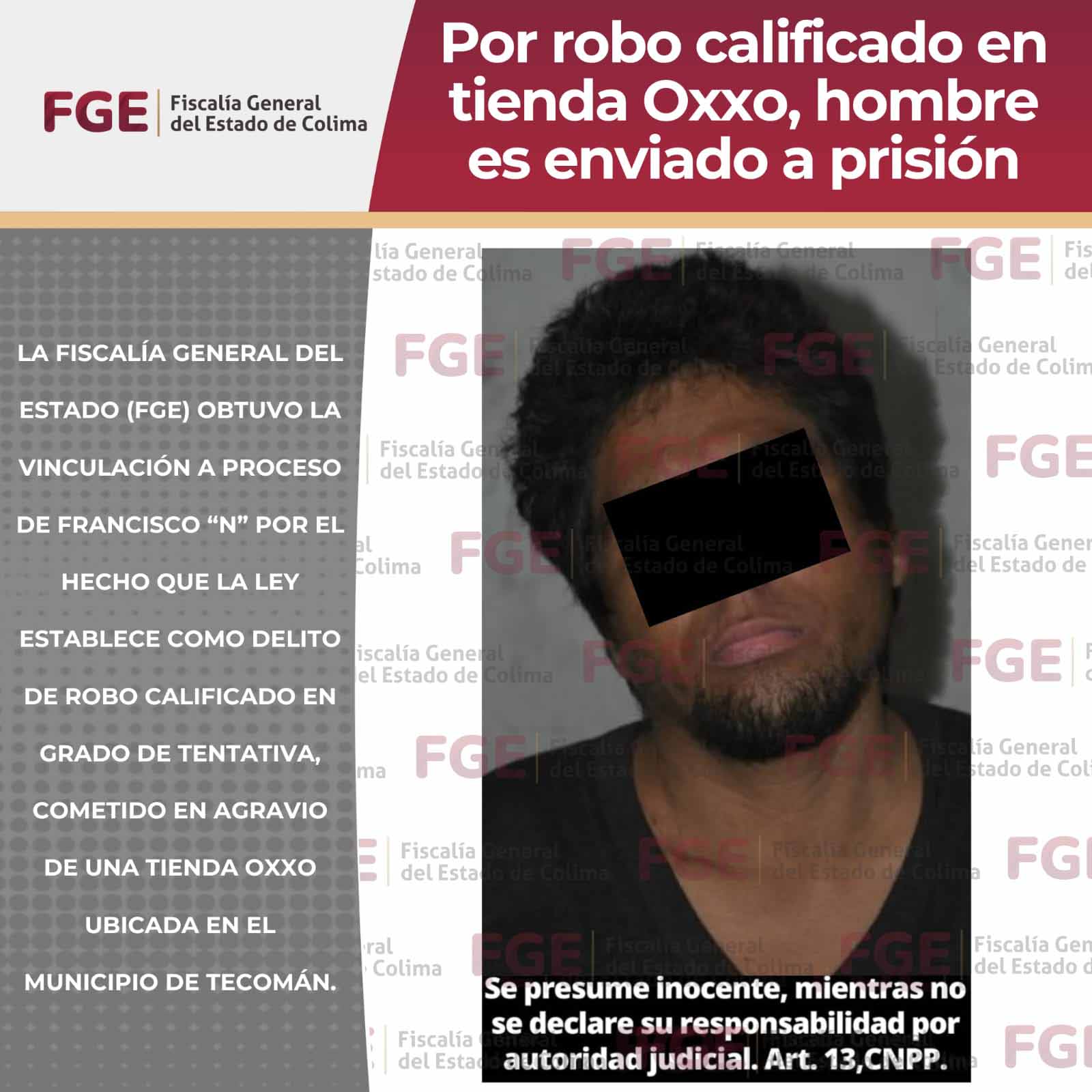 La Fiscalía General del Estado (FGE) obtuvo la vinculación a proceso de Francisco “N” por el hecho que la ley establece como delito de robo calificado en grado de tentativa, cometido en agravio de una tienda Oxxo ubicada en el municipio de Tecomán.