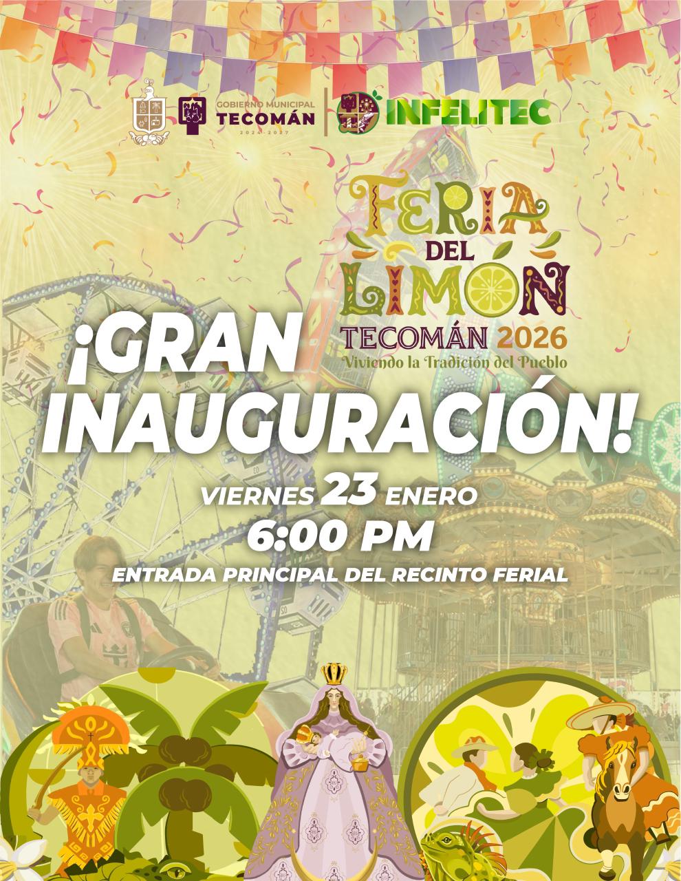 El presidente municipal de Tecomรกn, Armando Reyna Magaรฑa, invitรณ a las familias tecomenses y visitantes a asistir a la Inauguraciรณn Oficial de la Feria del Limรณn Tecomรกn 2026, que se llevarรก a cabo el prรณximo viernes 23 de enero, en punto de las 6:00 de la tarde, en el arco principal del recinto ferial.