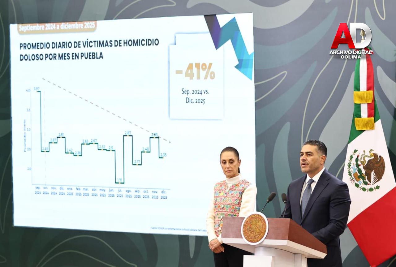 De acuerdo con el informe, entre septiembre de 2024 y diciembre de 2025 el promedio diario de h0micidio doloso en Puebla se redujo en 41 por ciento, al pasar de 3.97 a 2.35 h0micidios diarios. Asimismo, los delitos de alto impacto registraron una disminución del 11 por ciento al comparar 2024 con 2025.