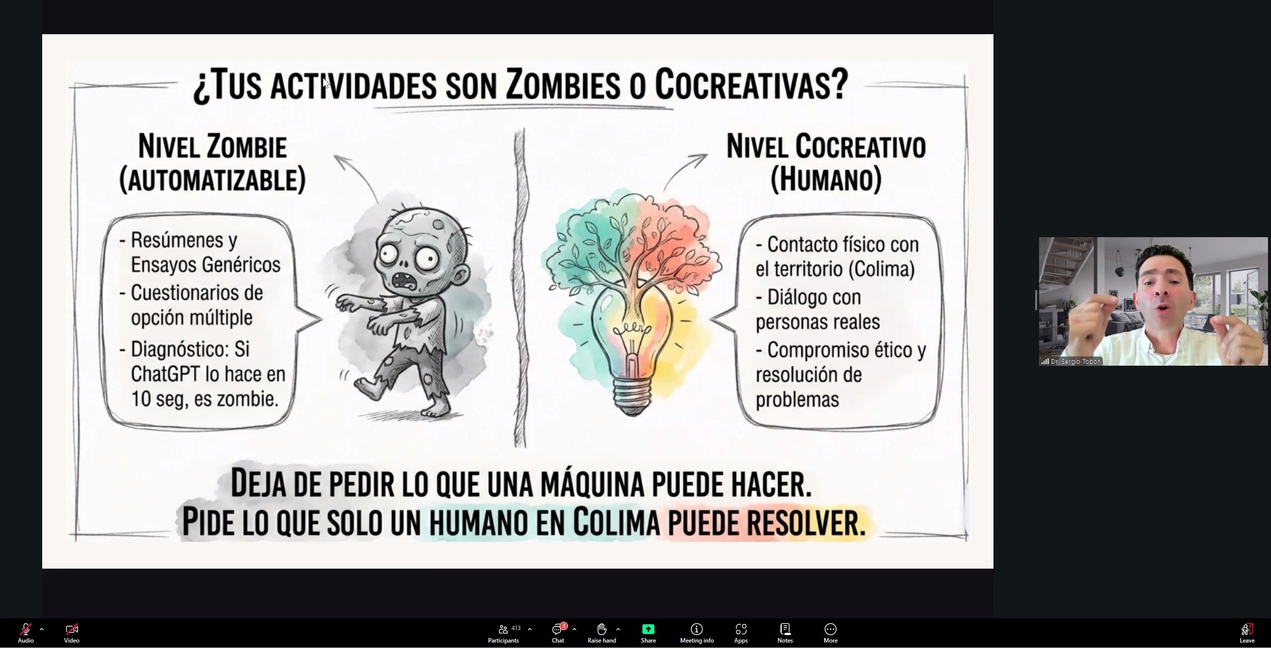 Propuso, entonces, dejar de propiciar lo que algunos investigadores llaman “tareas zombis”, que sólo generan dependencia a la Inteligencia Artificial “Estas tareas lo único que promueven son la automatización, la repetición y el reemplazo”.