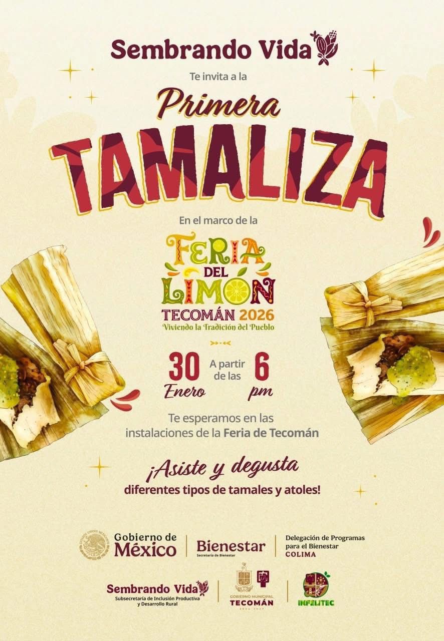 El presidente municipal de Tecomán, 𝗔𝗿𝗺𝗮𝗻𝗱𝗼 𝗥𝗲𝘆𝗻𝗮 𝗠𝗮𝗴𝗮𝗻̃𝗮, extendió una invitación a la ciudadanía para asistir a la 𝗣𝗿𝗶𝗺𝗲𝗿𝗮 𝗧𝗮𝗺𝗮𝗹𝗶𝘇𝗮, organizada por 𝗦𝗲𝗺𝗯𝗿𝗮𝗻𝗱𝗼 𝗩𝗶𝗱𝗮, la cual se realizará en el marco de la 𝗙𝗲𝗿𝗶𝗮 𝗱𝗲𝗹 𝗟𝗶𝗺𝗼́𝗻 𝗧𝗲𝗰𝗼𝗺𝗮́𝗻 𝟮𝟬𝟮𝟲.