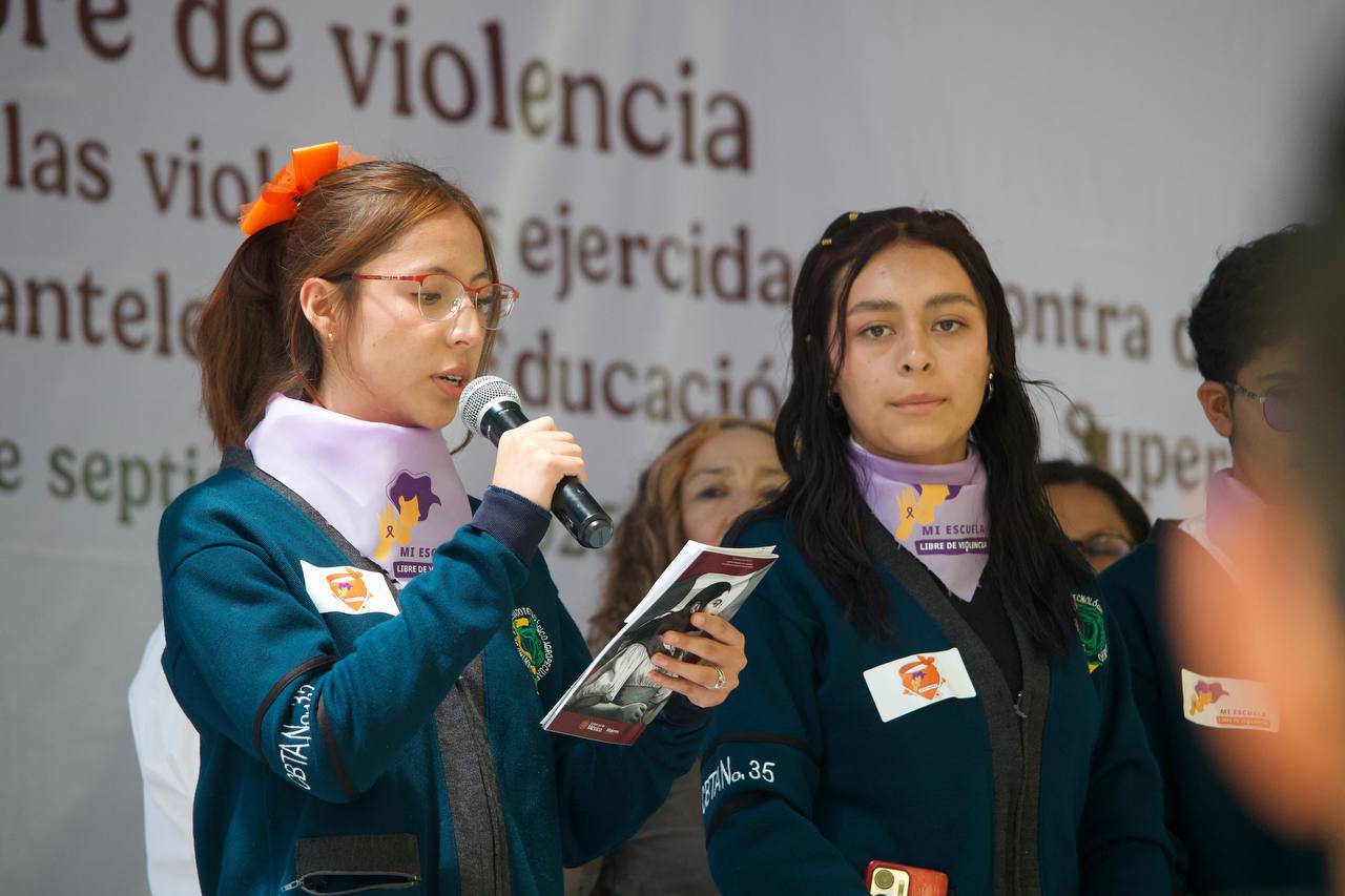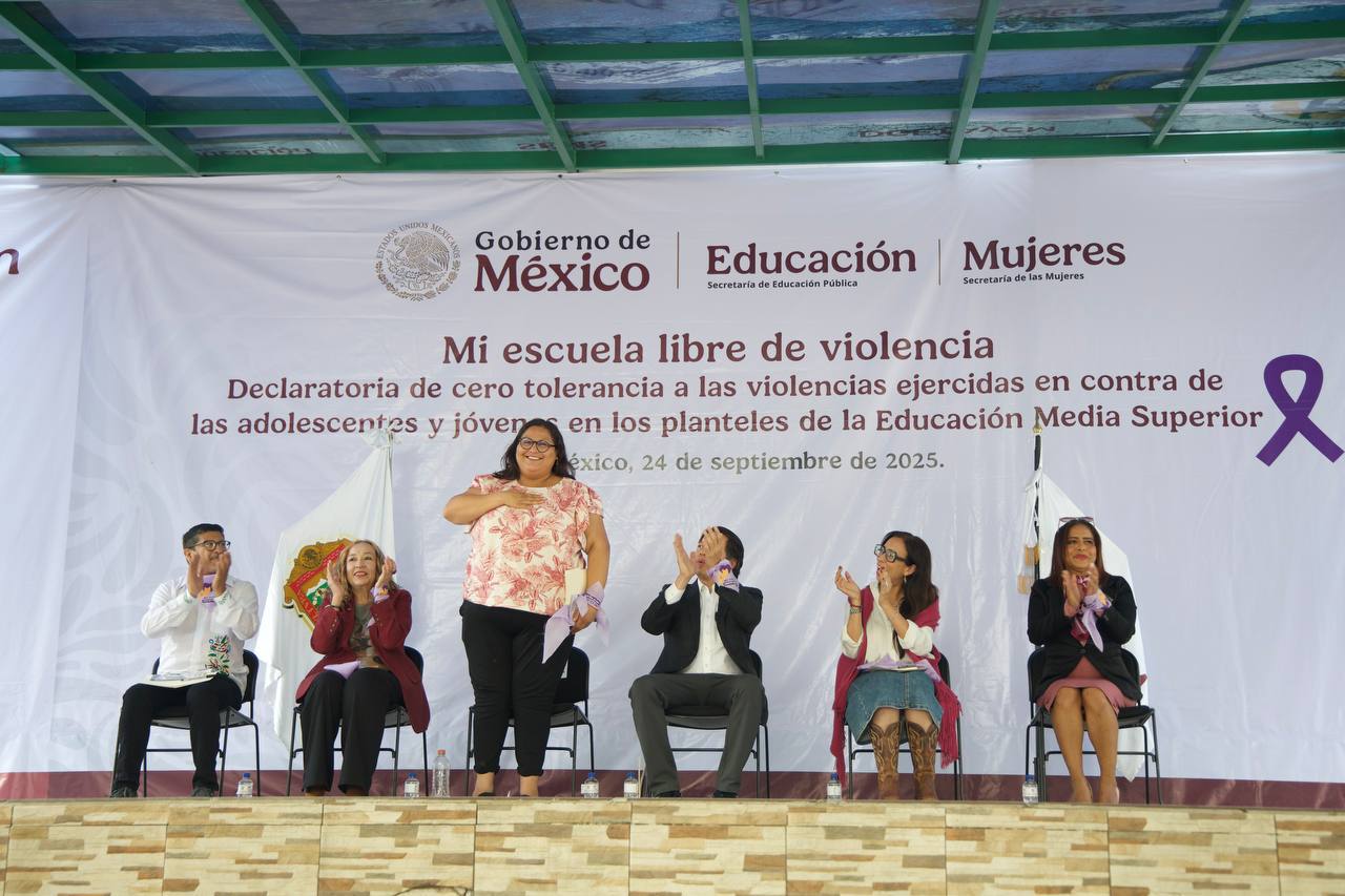La segunda ruta de acción es la Declaratoria de “Cero Tolerancia” a las Violencias Ejercidas en Contra de las Adolescentes y Jóvenes en los planteles de la Educación Media Superior, emitida el 24 de septiembre de 2025, y para la cual la Secretaría de las Mujeres ha trabajado en los últimos meses en la capacitación de personal directivo y docente.