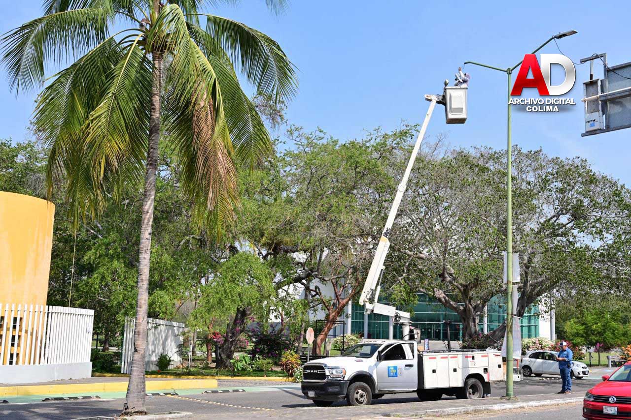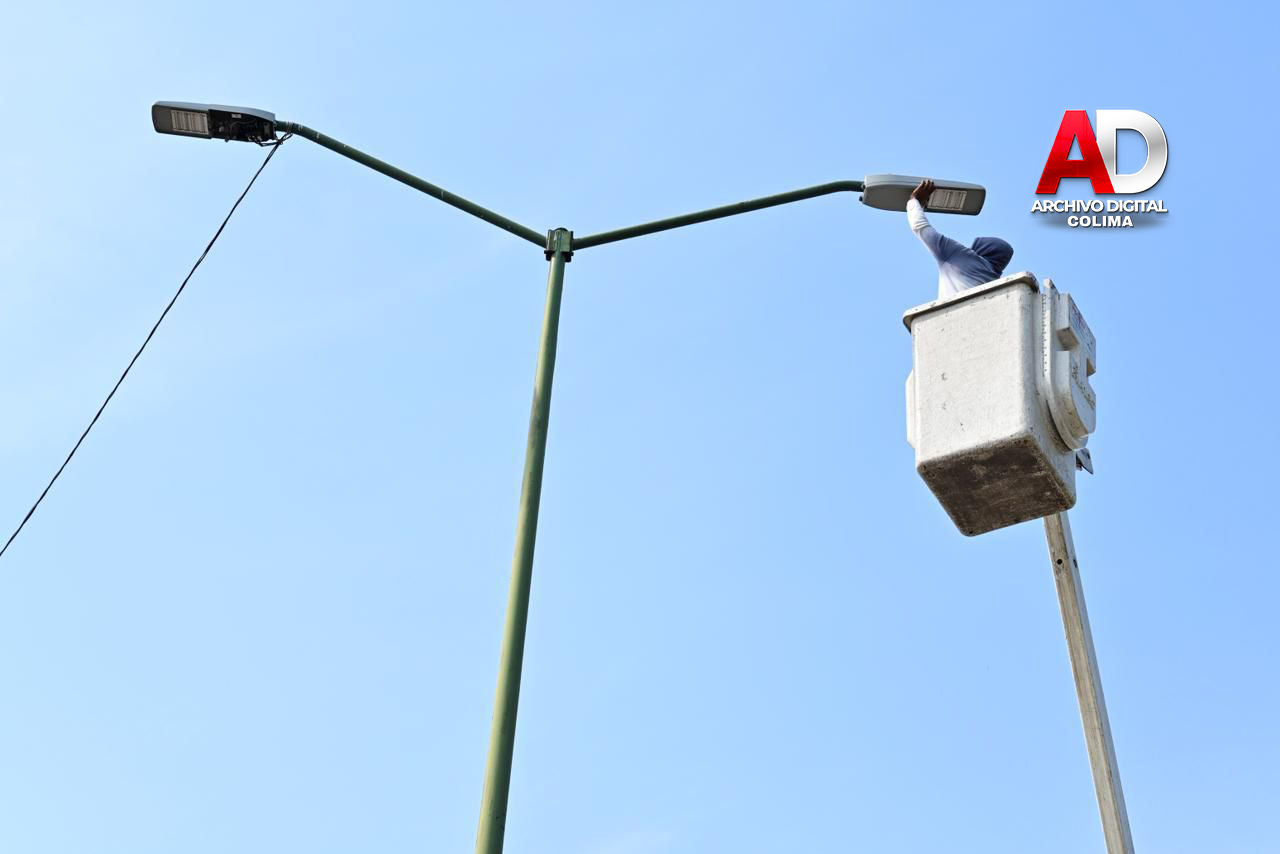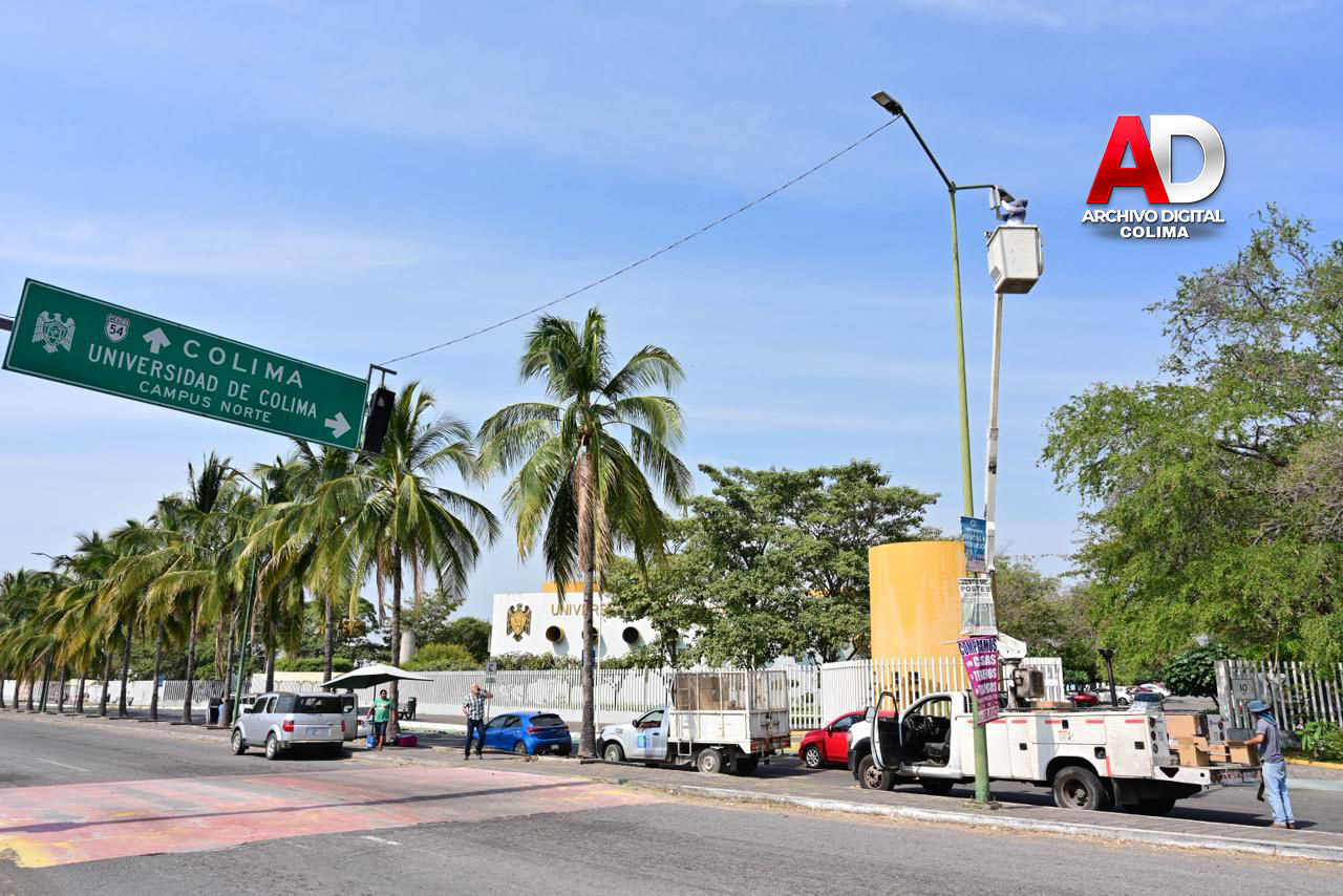 La cuadrilla de Alumbrado Público, adscrita a la Dirección General de Servicios Públicos, realizó trabajos de sustitución de luminarias por tecnología LED de luz blanca en la avenida Camino Real, frente a la Facultad de Derecho de la Universidad de Colima, que representa el ingreso principal a nuestro municipio.