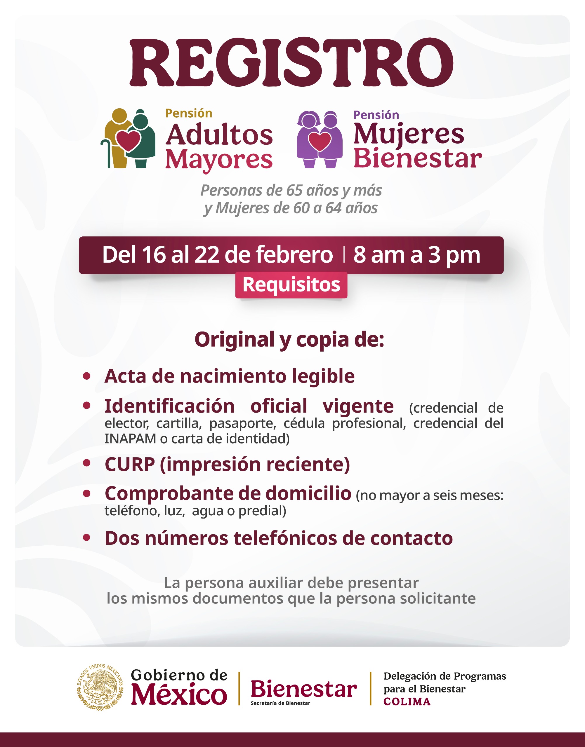 La secretaria de Bienestar, Ariadna Montiel Reyes, recordó que a partir de este lunes 16 y hasta el domingo 22 de febrero, se realiza el registro a la Pensión para el Bienestar de las Personas Adultas Mayores de 65 años y más, así como a la Pensión Mujeres Bienestar para las mexicanas de 60 a 64 años.