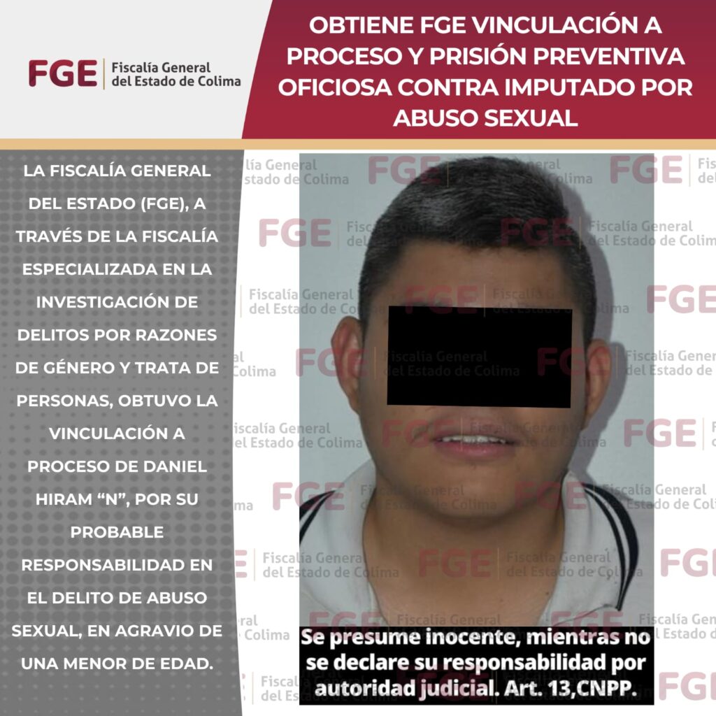 La Fiscalía General del Estado (FGE), a través de la Fiscalía Especializada en la Investigación de Delitos por Razones de Género y Trata de Personas, obtuvo la vinculación a proceso de Daniel Hiram “N”, por su probable responsabilidad en el delito de abuso sexual, en agravio de una menor de edad.