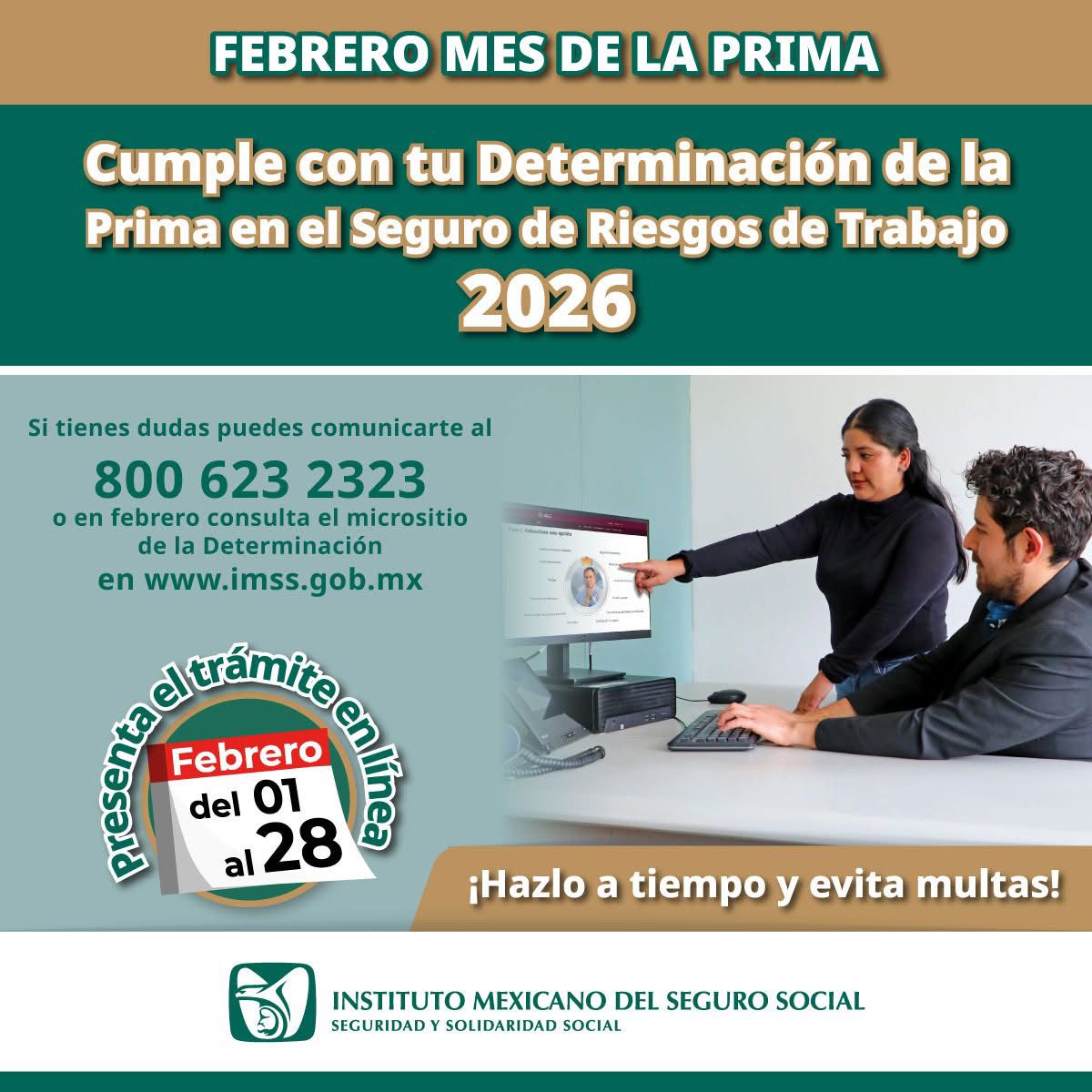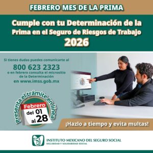 El Instituto Mexicano del Seguro Social (IMSS) en Colima recuerda a las y los patrones la importancia de presentar, a más tardar el 28 de febrero, la Determinación de la Prima en el Seguro de Riesgos de Trabajo, trámite anual que contribuye al adecuado funcionamiento del sistema de seguridad social y a la protección de las personas trabajadoras.