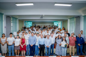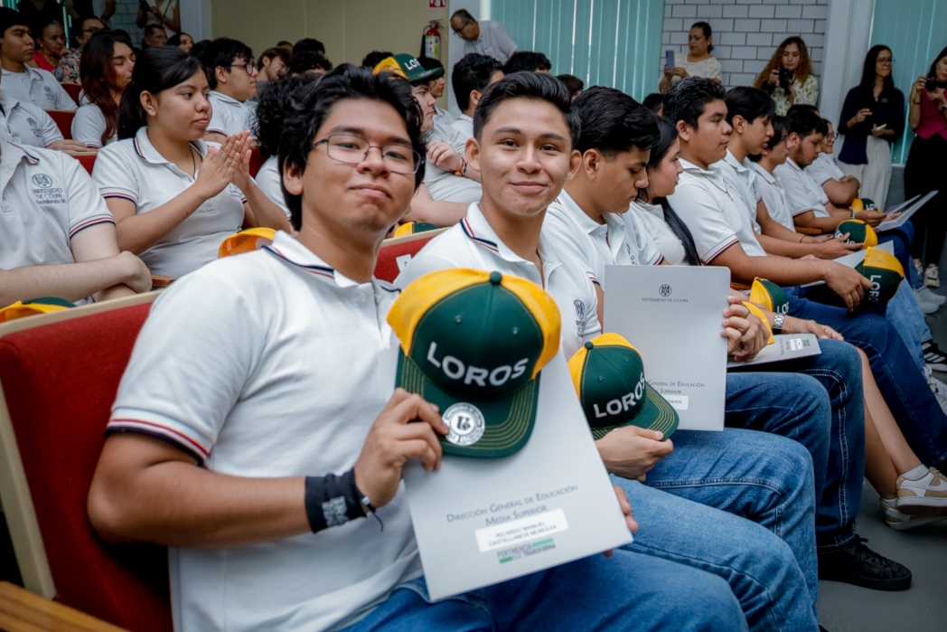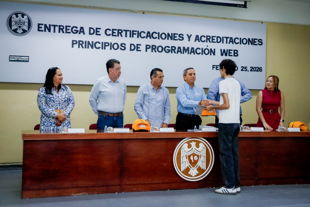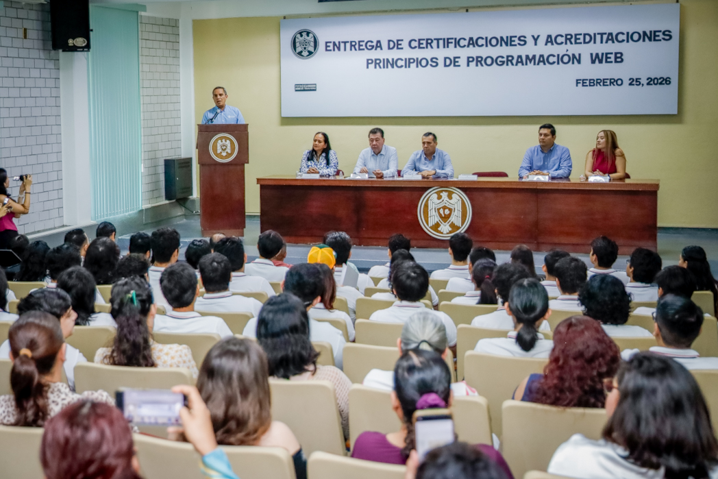Este miércoles, en el auditorio de Humanidades del Campus Villa de Álvarez, 43 estudiantes del área de Técnico analista programador del Bachilleratos 16 recibieron, de manos del rector de la Universidad de Colima, Christian Jorge Torres Ortiz Zermeño, una certificación de competencias digitales en programación web.
