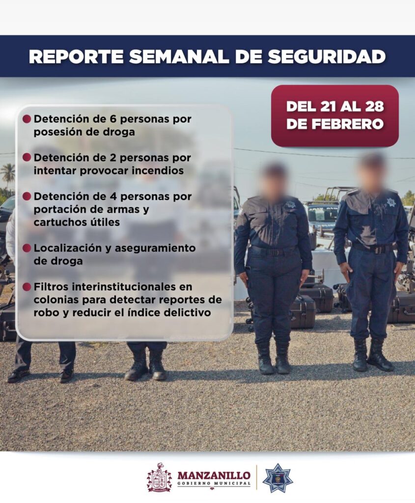 La Dirección de Seguridad Pública en coordinación con el Gobierno Municipal refrenda su firme compromiso con la prevención del delito y la construcción de la paz en Manzanillo, invita a la ciudadanía a reportar cualquier situación sospechosa o de riesgo a los números de emergencia 911 y 089 Denuncia Anónima.