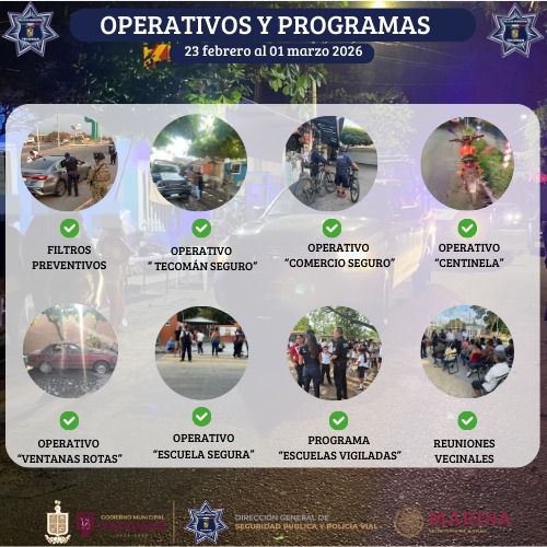 El Gobierno Municipal de Tecomán, a través de la Dirección General de Seguridad Pública y Policía Vial, dio a conocer el reporte semanal de acciones y resultados correspondientes al periodo del 23 de febrero al 01 de marzo de 2026, como parte del trabajo permanente en materia de prevención, vigilancia y proximidad social en el municipio.