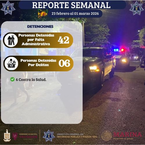 De acuerdo con el informe, durante esta semana se registraron 42 personas detenidas por faltas administrativas, así como 6 personas detenidas por la probable comisión de delitos, de las cuales 6 corresponden a delitos contra la salud.